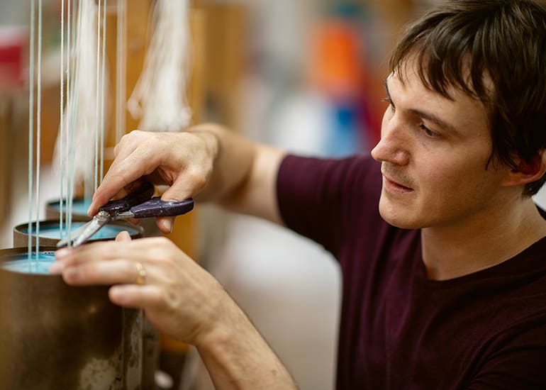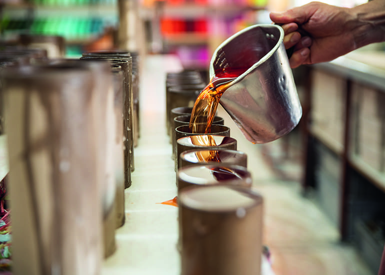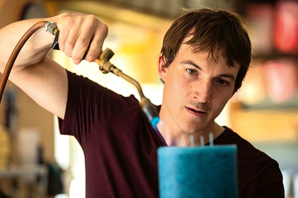 Die Unikate werden in einem aufwändigen Verfahren von Hand hergestellt. Vom Abwägen und Mischen der Farbpigmente über das Giessen bis hin zum Abflammen und Trocknen braucht es über sieben Stunden pro Kerzenserie.